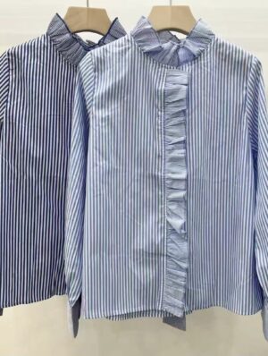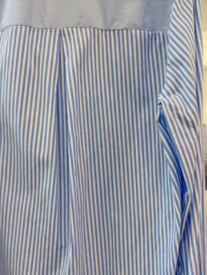 Confeccionada 100% en algodón con tapabotones de volante en listas más finitas a juego con puños, cuello y canesú de la espalda