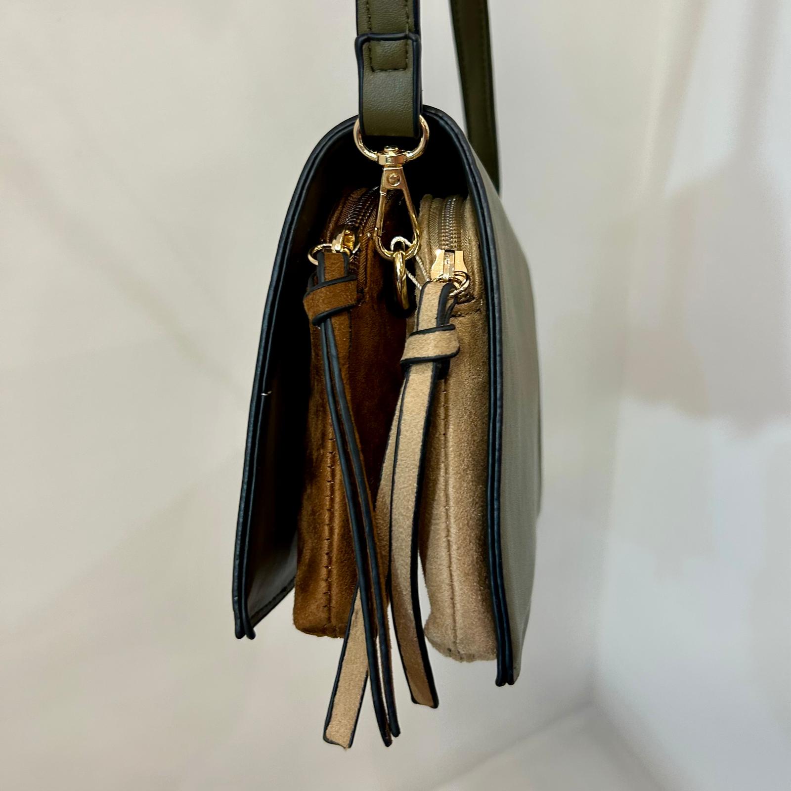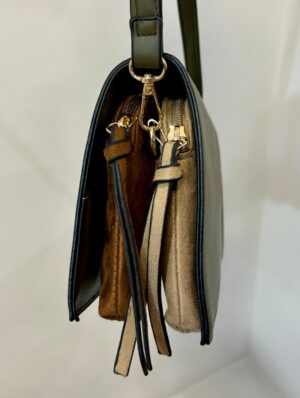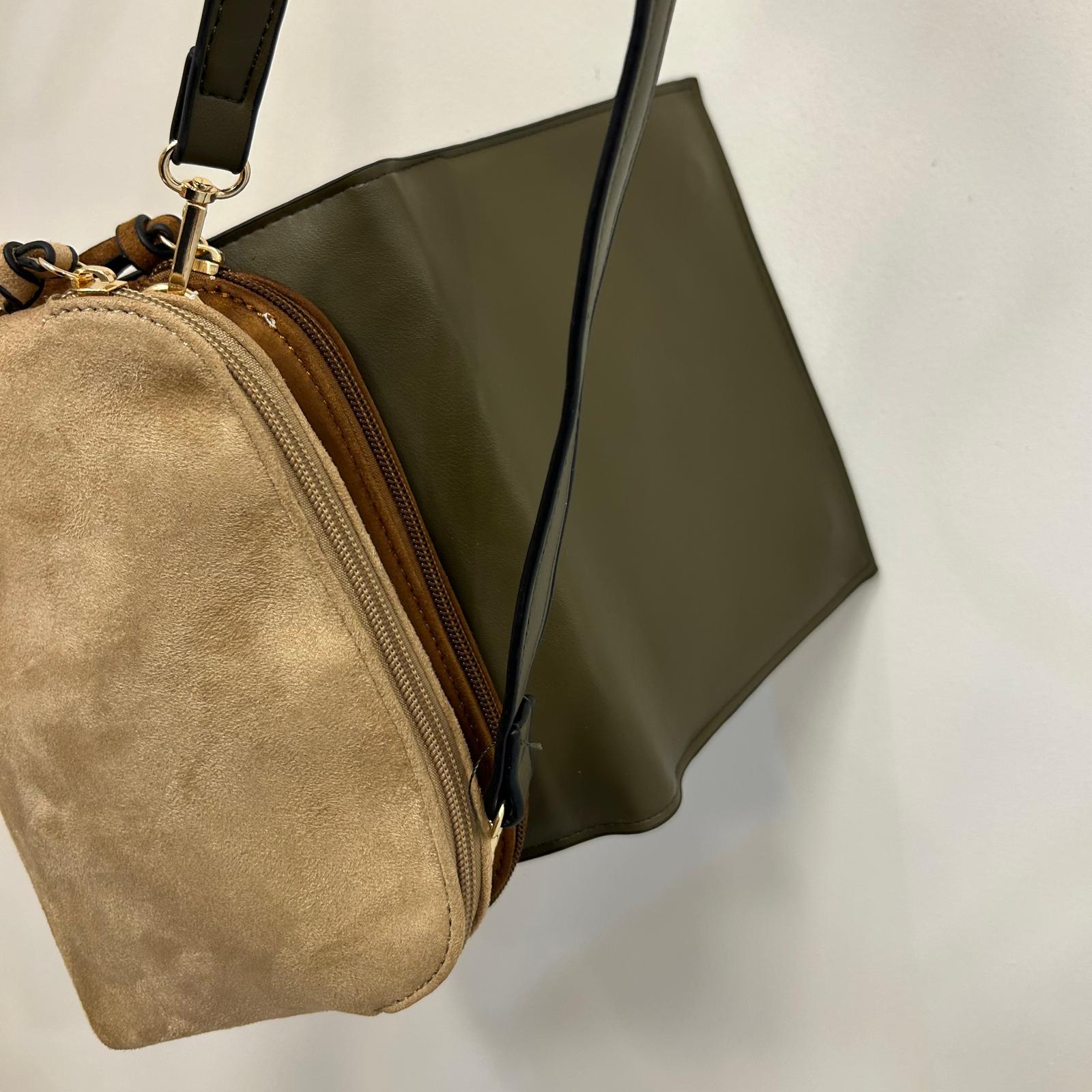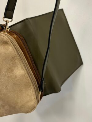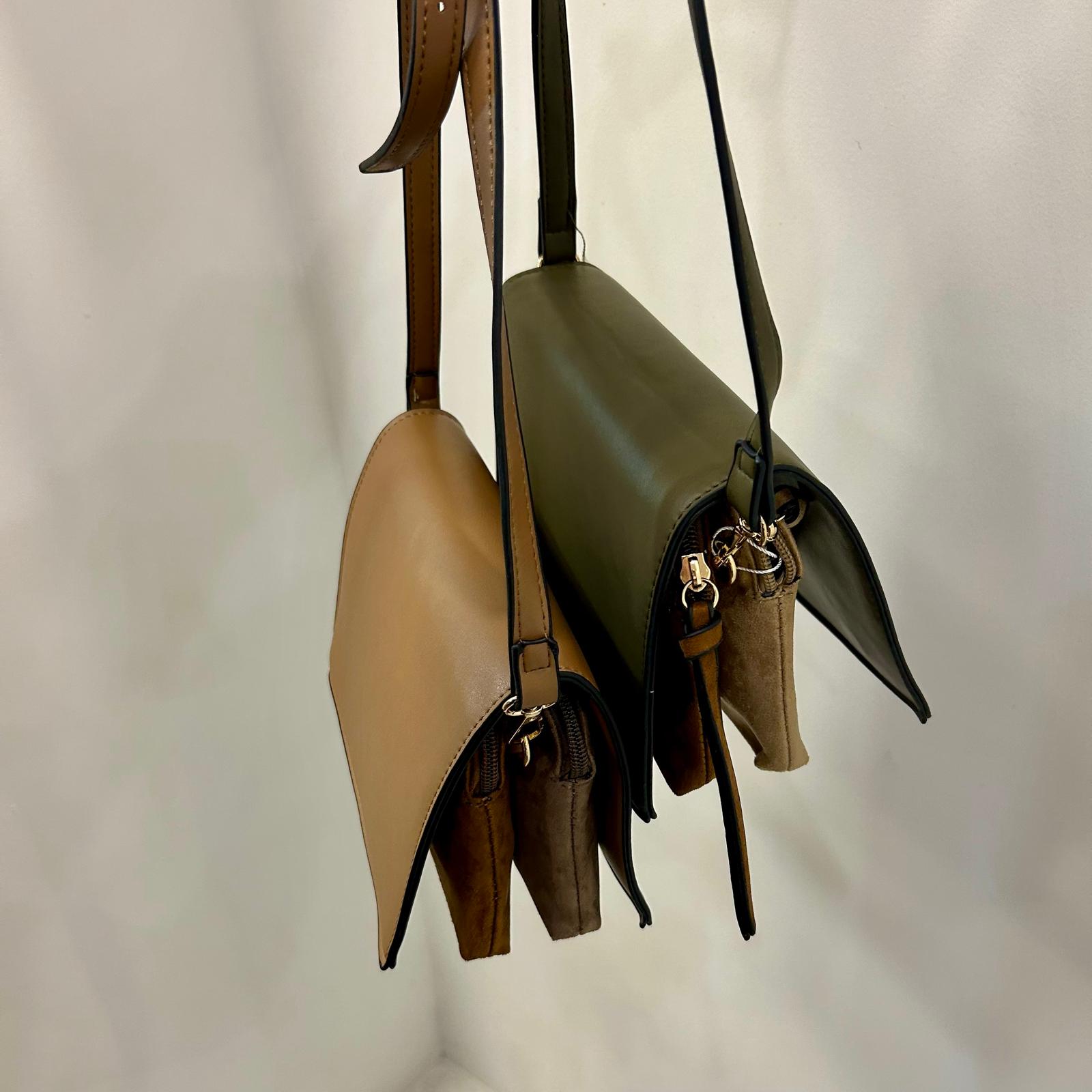 Bolso bandolera de líneas minimalistas con mezcla de acabados en piel y ante. Elegante, versátil y con cierre seguro, ideal para llevar de día o de noche. Disponible en verde khaki y camel.